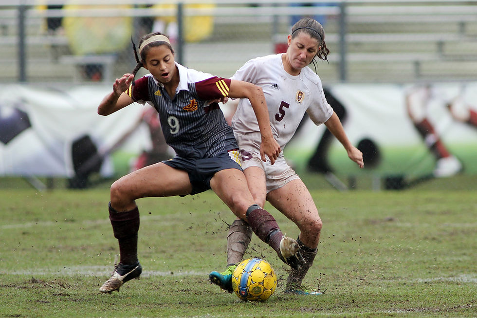 JCJC’s Kelsey Hannaford (17) battles a Pearl River player in the rain and mud during Saturday morning’s MACJC/Region 23 Tournament championship game at Hinds Community College.